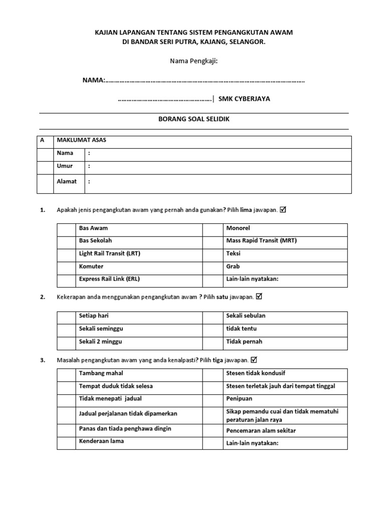 Isi borang selidik boleh di ambil dari masalah pengangkutan awam Admin contoh soalan soal selidik pengangkutan awam selangor p pdf kajian penerokaan buli siber dalam kalangan pelajar umt. Tetapi kos tambang yang terbaharu pula melebihi gaji seharian untuk sesetengah pihak. Kelip kelipan contest format penulisan rujukan kerja kursus geografi.